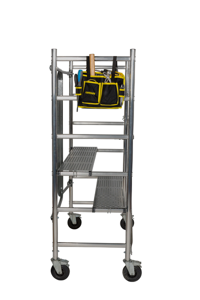 - 4 roues de déplacement pivotantes à frein Ø 150 mm porteuses en position de travail.