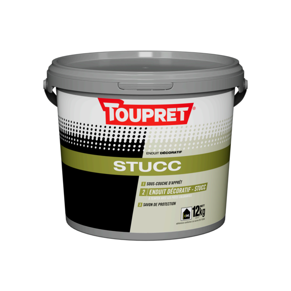 - Couleur : A teinter avec les PÂTES COLORANTES TOUPRET. L’enduit décoratif STUCC s’éclaircit fortement en séchant. L’intensité de la teinte est fonction de l’intensité du ferrage. Le SAVON DE PROTECTION ravive la teinte.